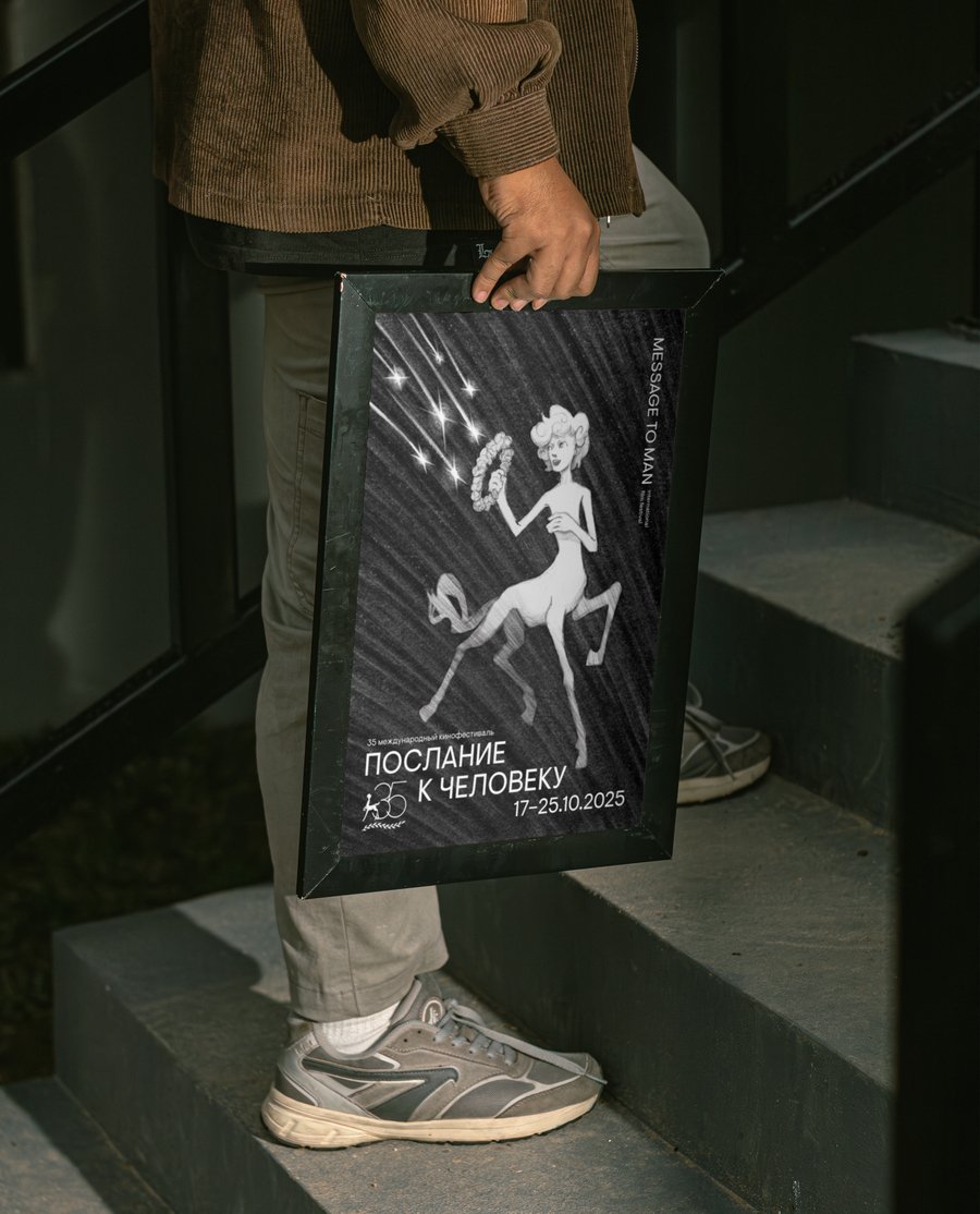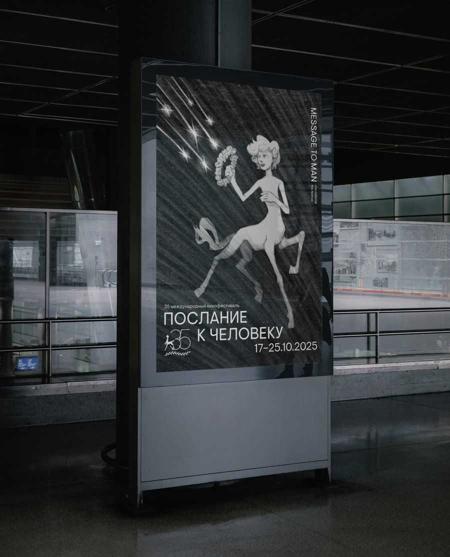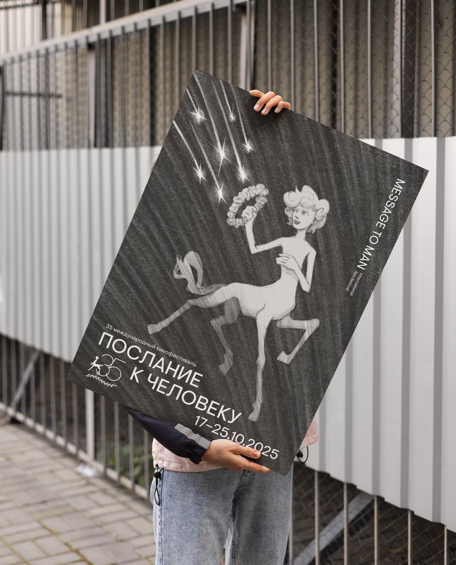 Эта идея воплощена в плакате через визуальную метафору: маскот фестиваля, Кентаврёнок, собирает в единый венок яркие звёзды. Каждая из них — символ самобытного творца, чей голос заслуживает быть услышанным. Зачастую эти авторы остаются в тени, но «Послание к человеку» даёт им возможность по-настоящему сиять, помогая кинематографическим шедеврам обрести свою благодарную публику.