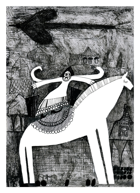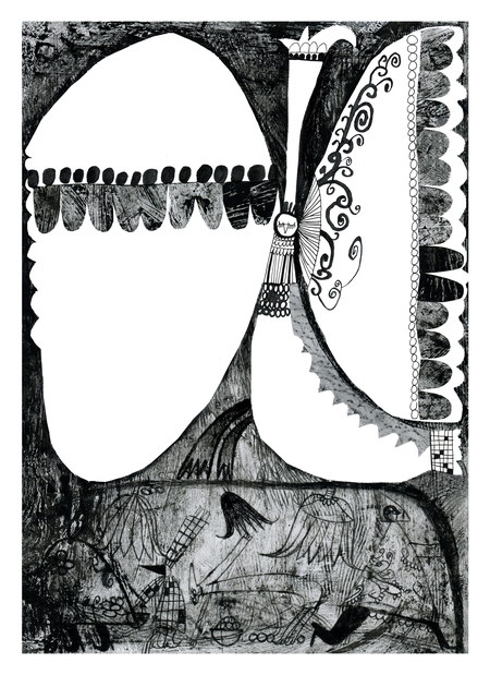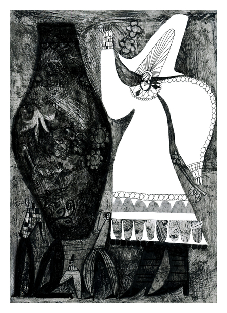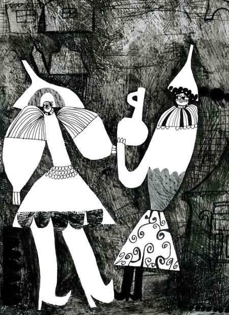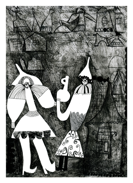 В диатипии я смогла передать богатство текстур, линий и деталей, а с помощью трафарета подчеркнула силуэты центральных персонажей, сделав их более комичными и выразительными.