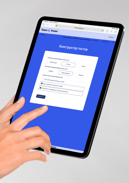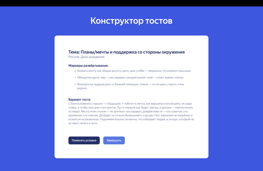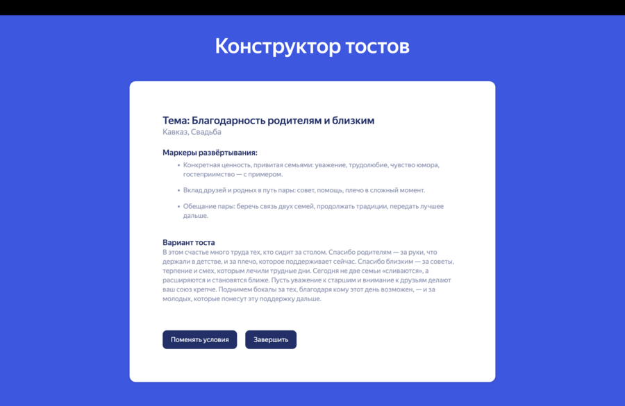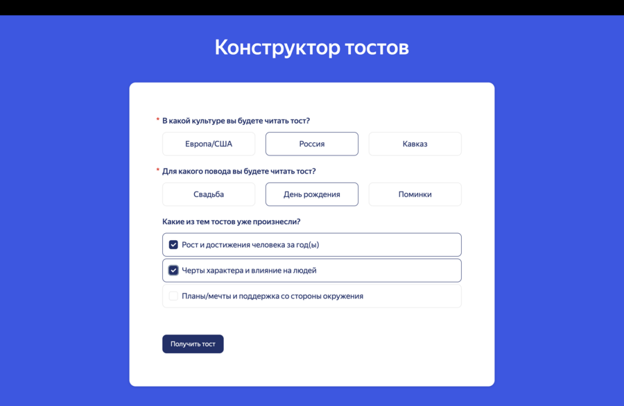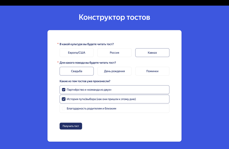 Конструктор тостов представляет собой интерактивную форму, которая по трём ответам выдаёт готовую заготовку для ритуальной речи.
