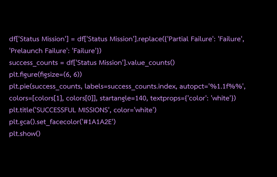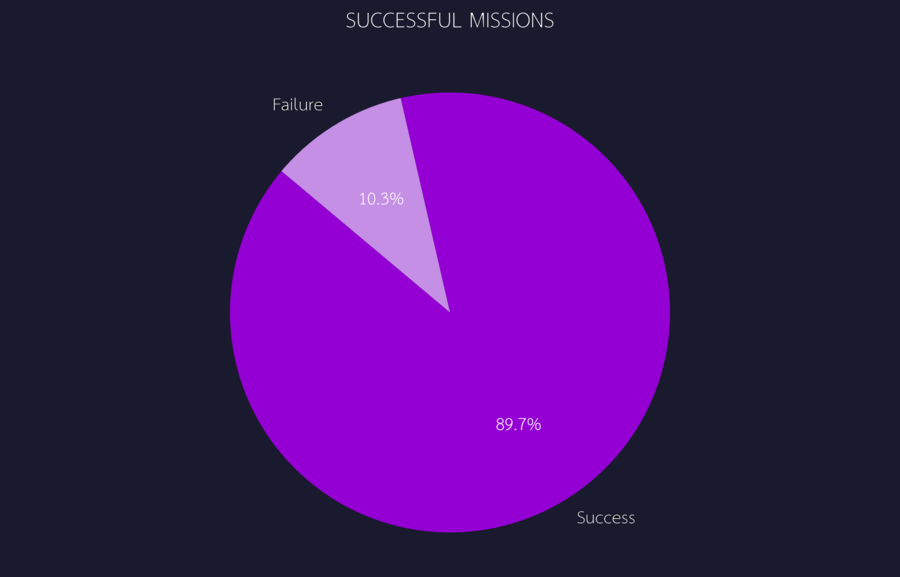 Вторая диаграмма показывает довольно оптимистичное соотношение удачных и неудачных миссий. В датасете также указаны partial и prelaunch failures, то есть частичные и предстартовые неудачи, но я решила объединить их в одно ёмкое failure.