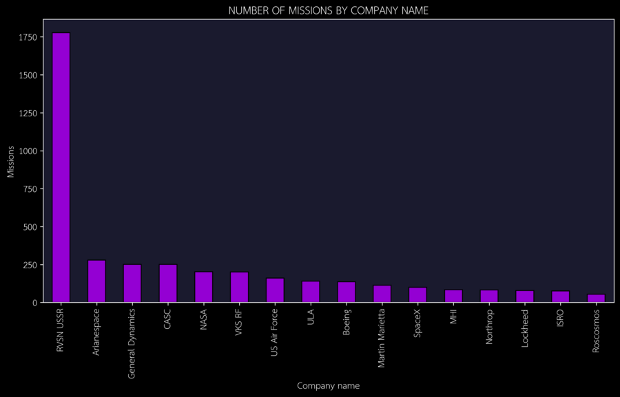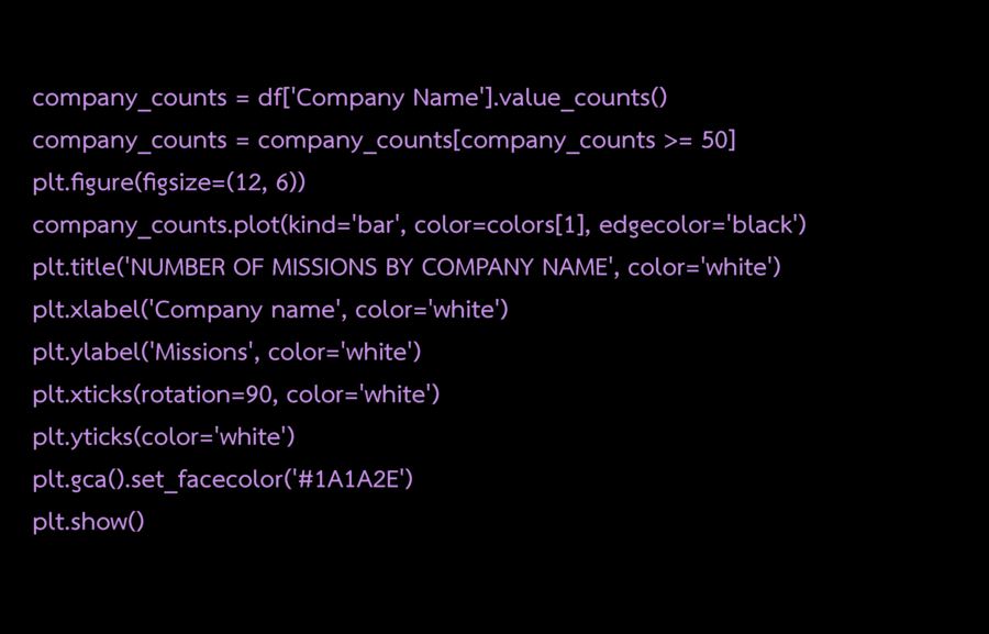Первая гистограмма показывает, какие компании наиболее активно участвовали и участвуют в исследовании космоса. Так как в датасете их указано довольно много, я решила оставить только те, чьих миссий было больше 50-ти. Можно увидеть, что RVSN USSR до сих пор является абсолютным лидером.