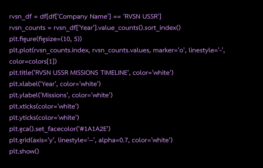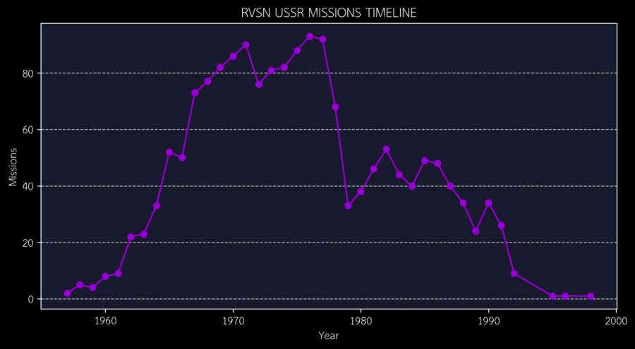 После первой гистограммы мне захотелось подробнее проследить таймлайн миссий от нашей RVSN USSR. График с маркерами показывает соотношение годов с количеством миссий. Пик, что неудивительно, снова приходится на разгар космической гонки и, естественно, сводится к нулю после 1991 года.
