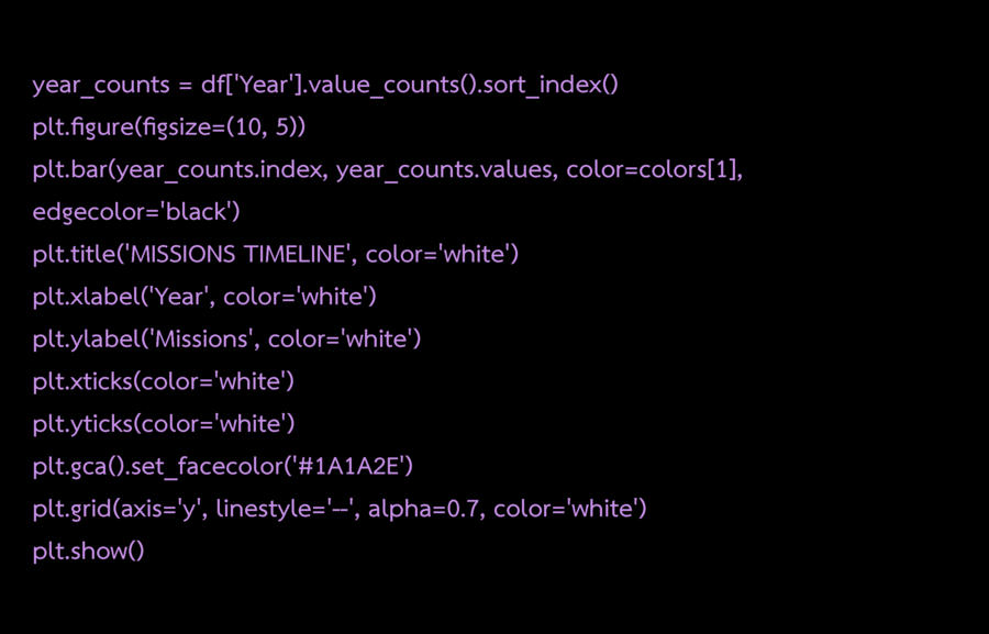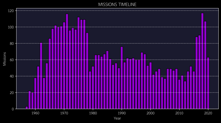 Третья диаграмма и вторая по счёту гистограмма показывает таймлайн космических миссий и их количество каждое десятилетие. Можно заметить, что основные пики активности приходятся на семидесятые (самый разгар космической гонки) и двадцатые годы уже нашего века.