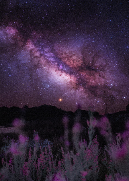 Infinite Space Galaxy photo. Mysterious, grainy, peaceful. Purple, pink, blue colors.