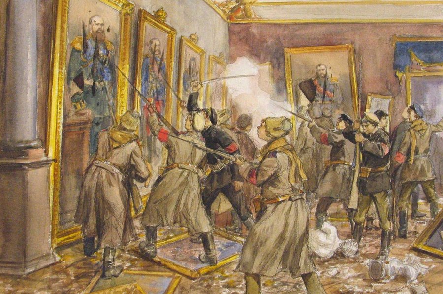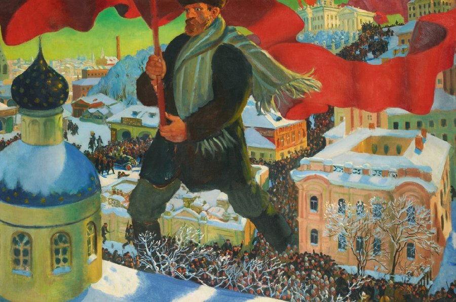 Иван Владимиров «Взятие Зимнего дворца» 1917\ Борис Кустодиев «Большевик» 1920