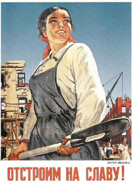 Виктор Иванов «Отстроим на славу!» 1945\ Виктор Говорков «Счастливые родятся под советской звездой!» 1936