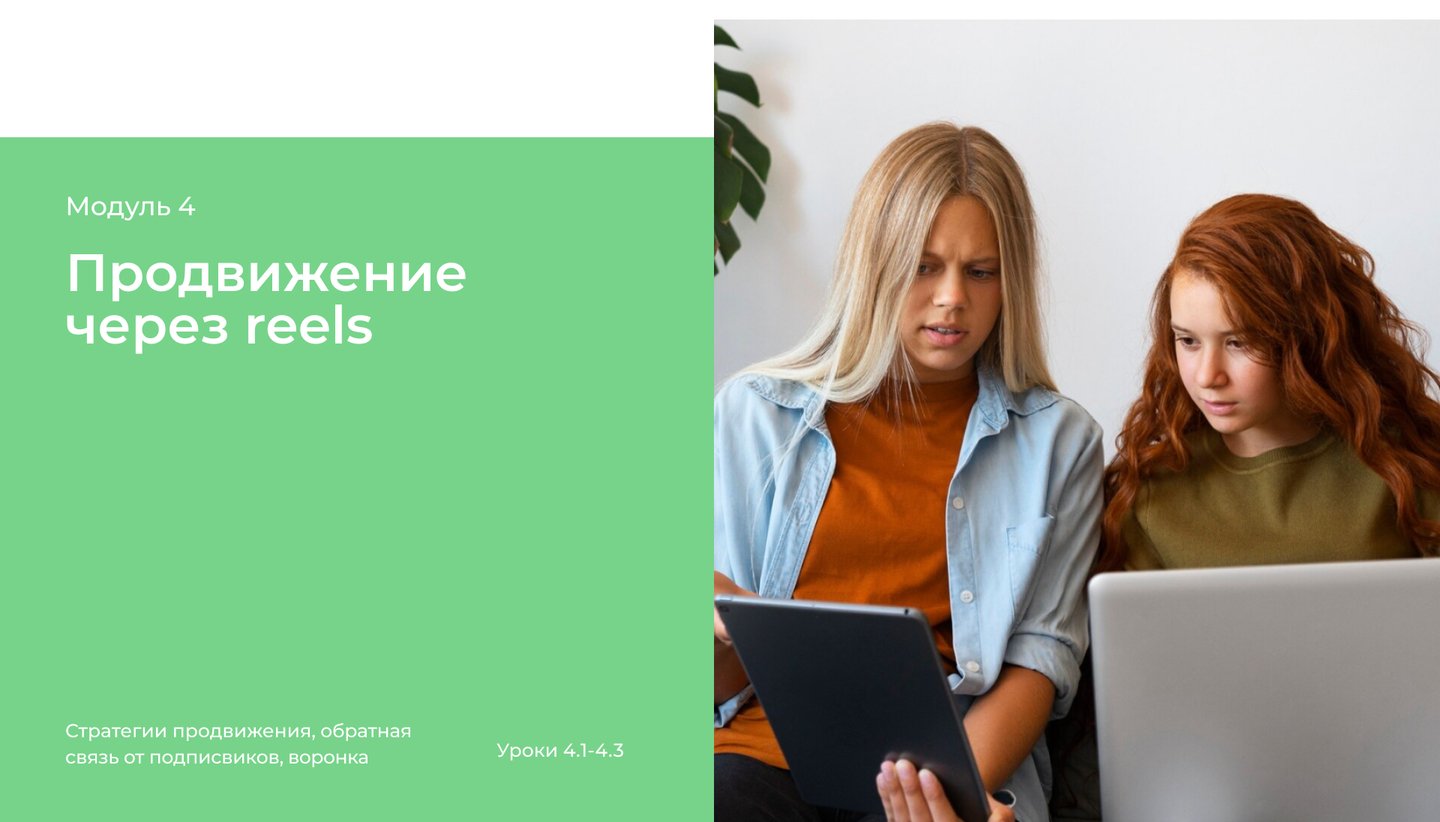 Материал этого модуля даст все необходимые практические инструменты для создания рилс, который станет отражением вашего стиля и ценностей. В результате модуля создадите серию рилс, которая расскажет вашу историю и станет частью личного бренда.