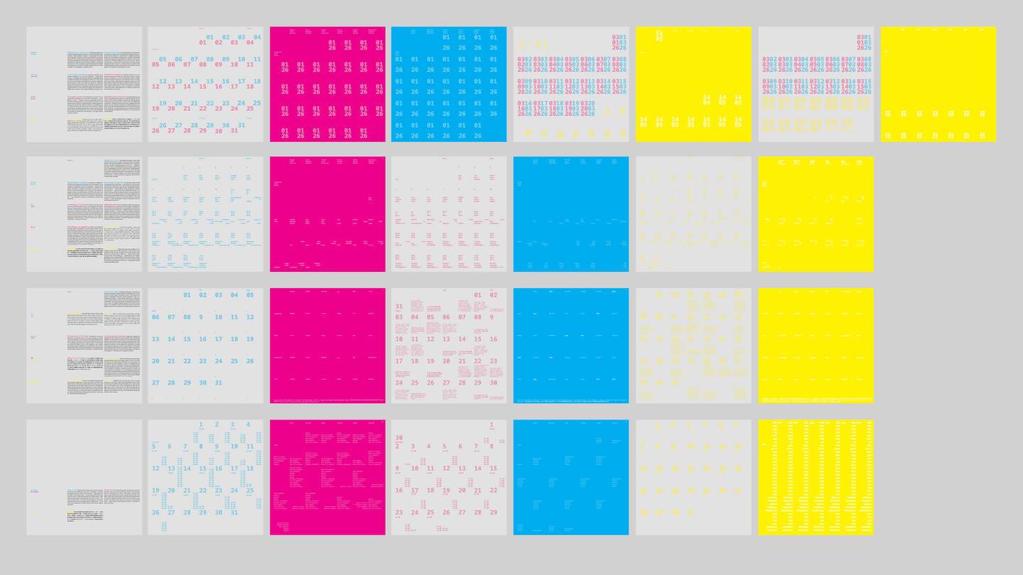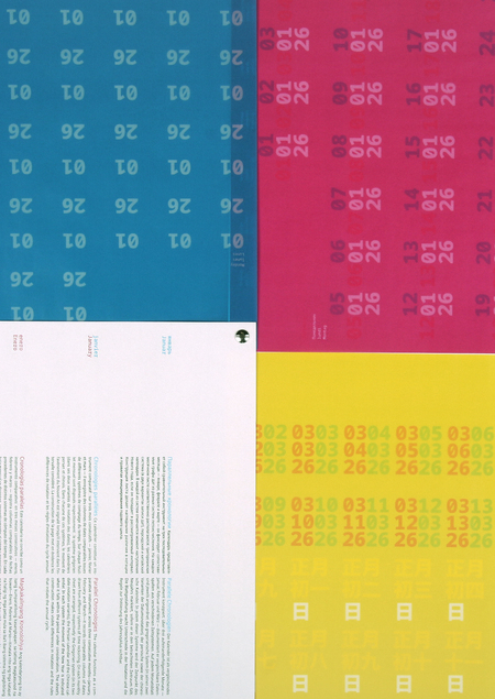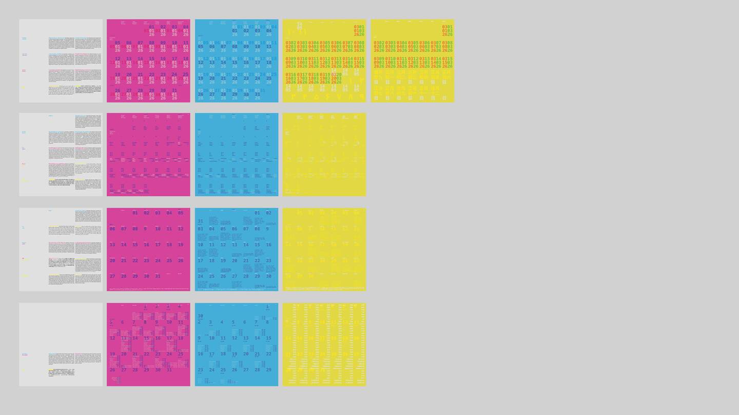 Серия из четырех календарей обращается к вопросам восприятия и репрезентации времени в разных языковых и культурных традициях. Каждый из проектов показывает, что привычные нам формы переживания времени не универсальны, а зависят от способов их выражения.