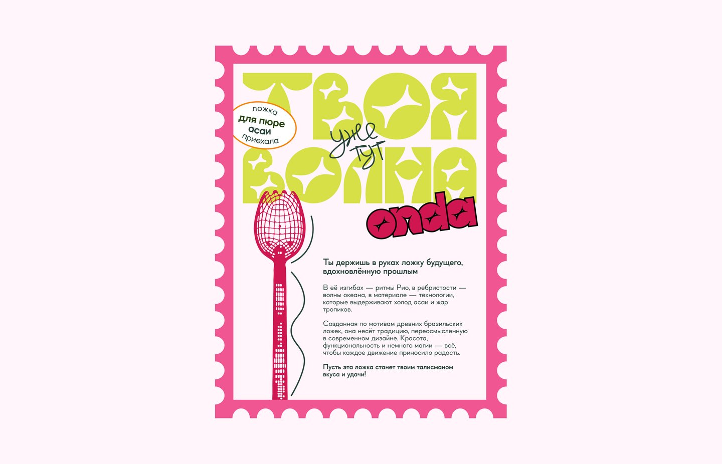 Ложка разработана специально для твёрдого пюре асаи. У нее идеальный угол изгиба для эргономичности и максимальной силы зачерпывания, а сама форма вдохновлена танцовщицами бразильского карнавала.