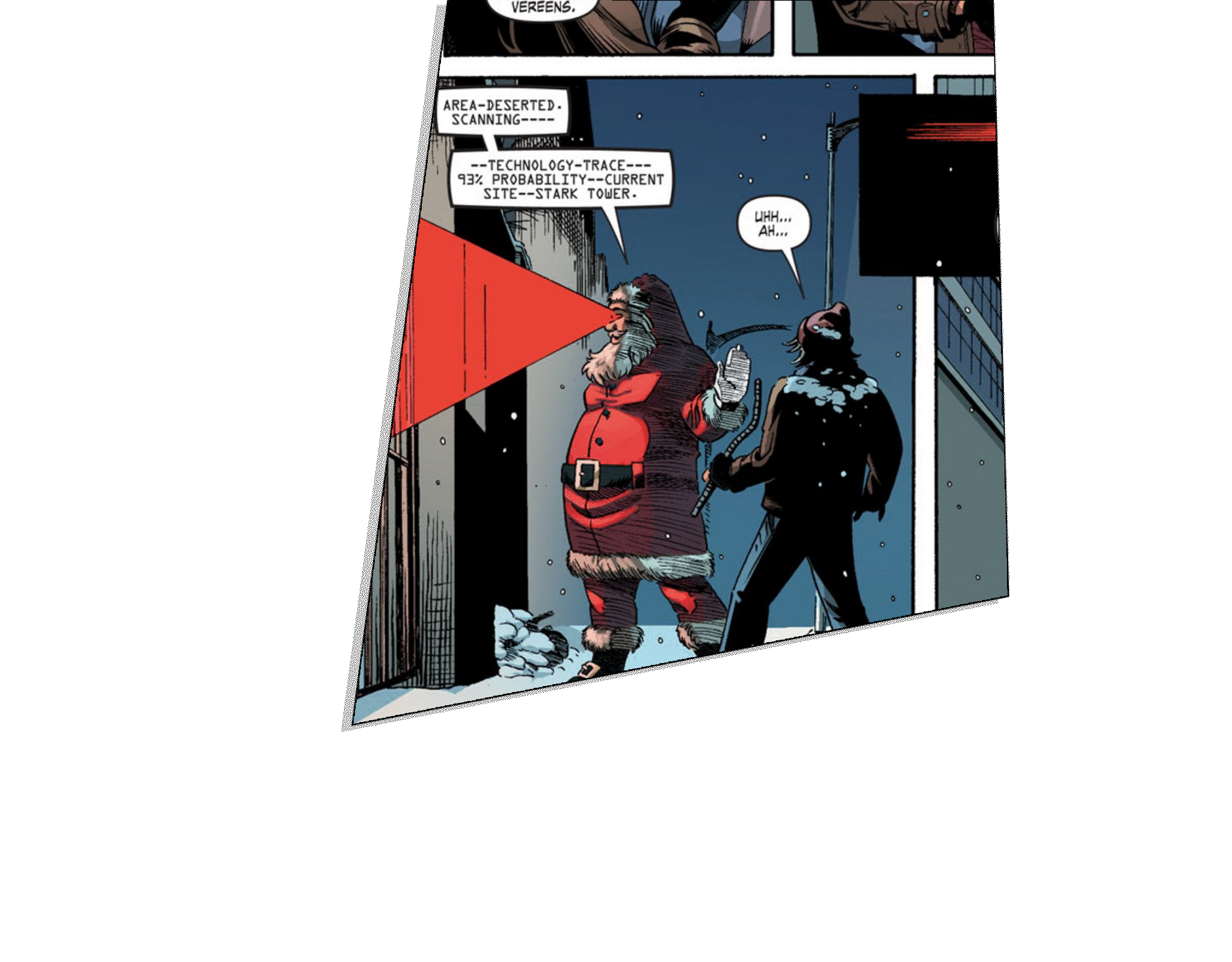 Выясняется, что сломанный Альтрон нашёл Вирджи и гипнотизировал её, чтобы она починила его, но её повреждённое сознание придало ему форму Санта-Клауса. Паук находит Вирджи, когда та пытается сдаться полиции, и приводит её на вечеринку Мстителей. Капитан Америка объясняет ей, что Санта существует как идеал добра, освобождая её от навязчивой идеи.
