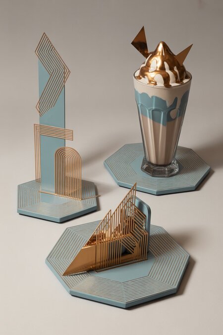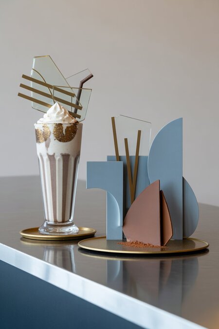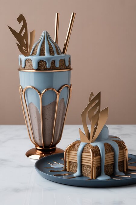 Promt: A huge premium milkshake and an interesting dessert for the Senza Regole cafe. A fusion of elegant geometric shapes. The style is a high-end Memphis design. Exquisite colors: dusty blue, warm gray-brown, and bronze-metal accents. The composition is harmonious and well-thought-out. The design is elegant, vector, and luxurious. Photorealistic. It’s a photo, not a picture.
