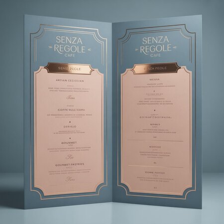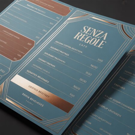 Promt: Premium class menu for Senza Regole cafe. Style is high-end design in Memphis. Exquisite colors: dusty blue, warm gray-brown and bronze-metallic accents. The composition is harmonious and well thought out. The design is elegant, vector and luxurious. Photography is photorealistic.