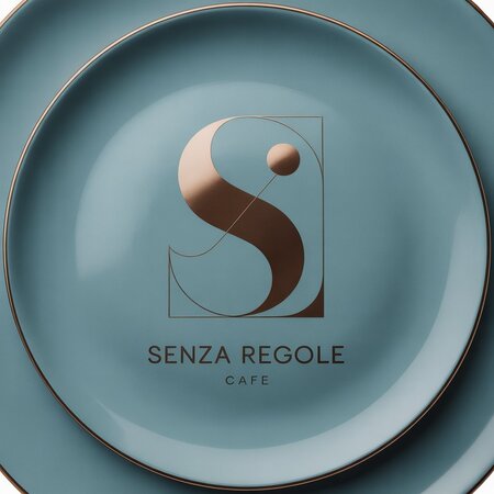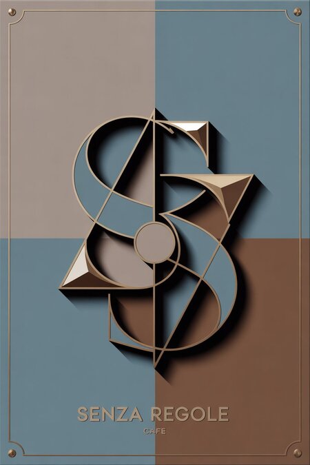 Promt: A premium logo for «Senza Regole» cafe. An abstract monogram is created by fusing elegant geometric shapes — a curved line intersects a tilted square, with a small circle adding balance. Style is upscale Memphis Design. Colors are sophisticated: dusty blue, warm taupe, and metallic bronze accents. The composition feels balanced and intentional. Sleek, vector art, luxury aesthetic.