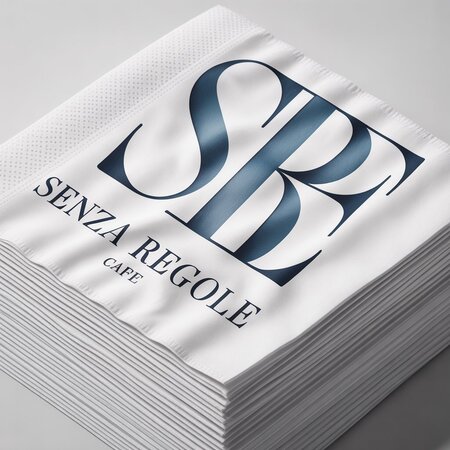 Promt: Premium stack of napkins for the «Senza Regole» cafe. The abstract monogram is created by merging elegant geometric shapes — Style is a high-end design in Memphis. Exquisite colors: dusty blue. The composition is harmonious and well-thought-out. The design is elegant, vector-based, and luxurious. Photorealistic, like a photograph