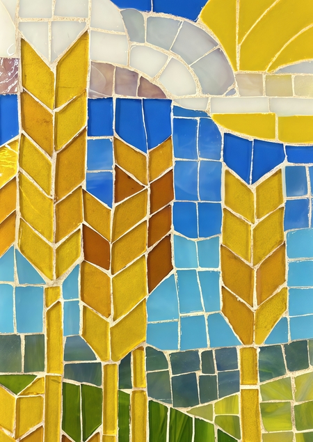 Во время размышлений о первой мозаике мне хотелось придумать что-то уютное и спокойное, и именно в этот момент мне представились поля пшеницы с мерно покачивающимися колосьями, залитыми солнцем. Основной задачей для меня являлось подобрать цвет стекла так, чтобы передать этот свет, отображающийся в колосьях.