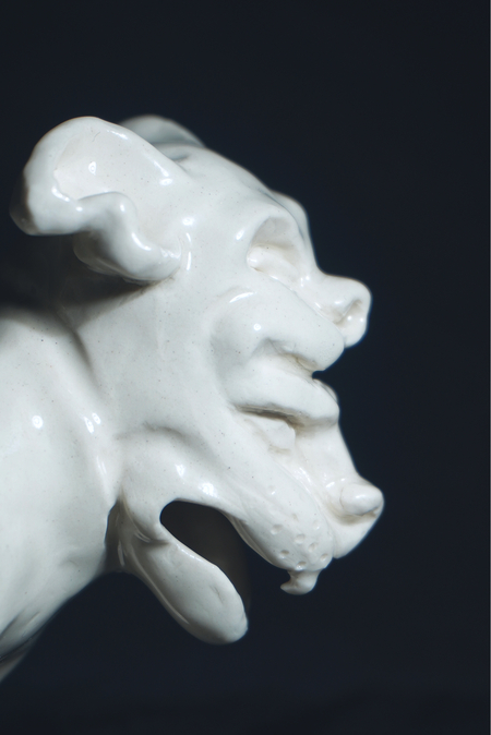 У фигурки две головы — одна агрессивная, c открытым ртом и более угловатыми глазами, а другая спокойная, закрытая и с более мягкими формами.