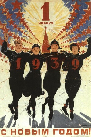 Новогодняя открытка после 1936 года; Плакат/открытка «С Новым годом! 1 января 1939», А. А. Кокорекин, 1938 год