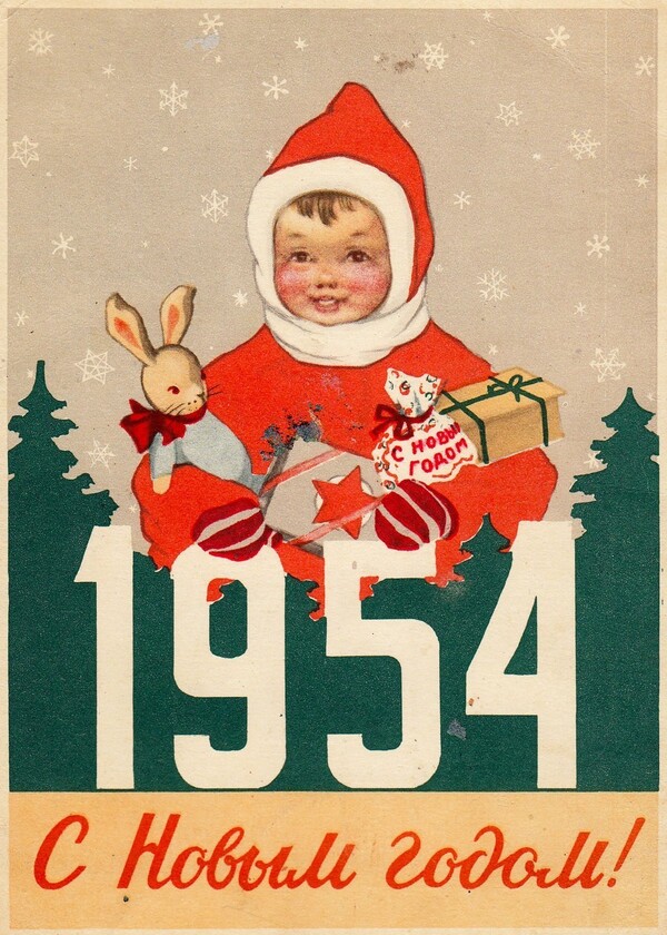 Открытка «С Новым годом», Э. В. Стрелкова, 1953 год; Открытка «С Новым годом мира и дружбы!», В. Ливанова, 1956 год
