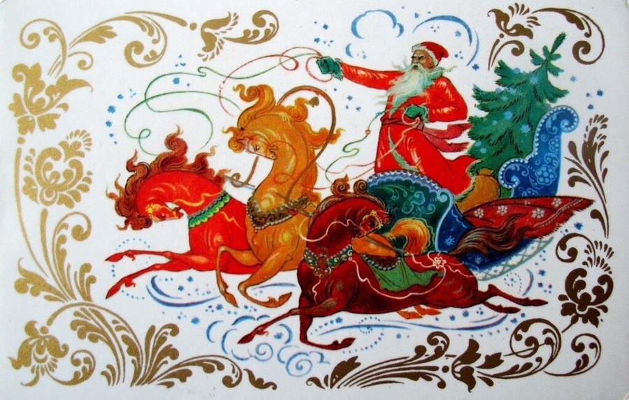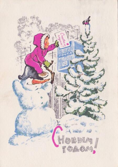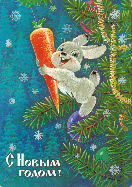 Почтовая открытка СССР «С Новым годом», худ. Ф. Марков, 1981 год; Новогодняя почтовая открытка СССР, худ. Т. Жебелева, 1989 год