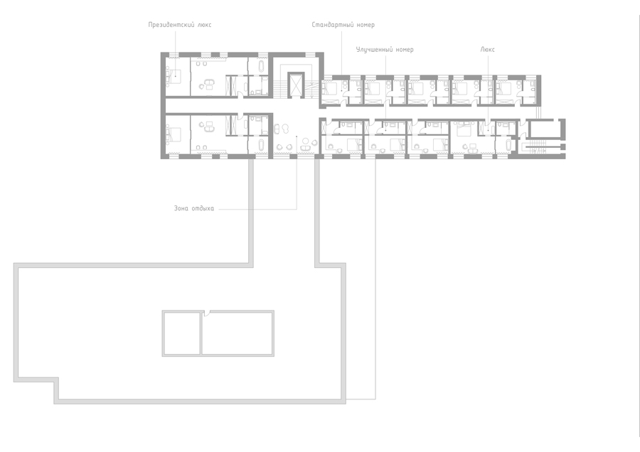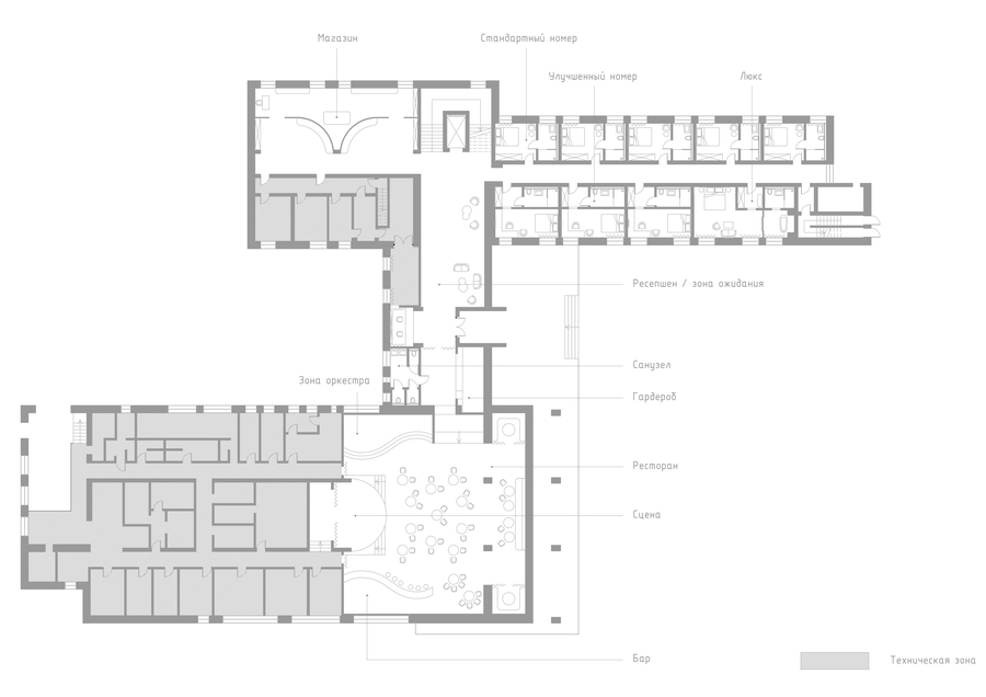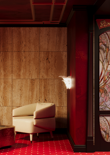 Отель «Nocturne» погружает в атмосферу золотой эпохи кабаре, сочетая в себе элементы стиля арт-деко и бурлеска. В проекте были использованы культовые предметы дизайна, которые несут в себе историческую ценность и помогают создать особую атмосферу шика и уюта.