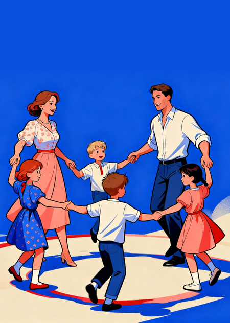 В центре композиции — семья, закруженная в хороводе, от мала до велика, объеденная в общим движением. Оно символизирует нерушимость связи и общие корни. Персонажи тянутся друг к другу, образуя пространство взаимной поддержки, доверия и общей радости.