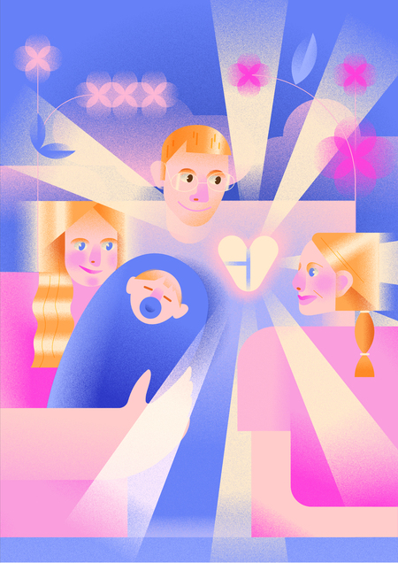 Иллюстрация включает в себя несколько персонажей, в плакатах их можно включать более малыми или большими группами, а геометричная структура позволяет удобно вписывать логотип. Центральным элементом иллюстративной айдентики является сердце