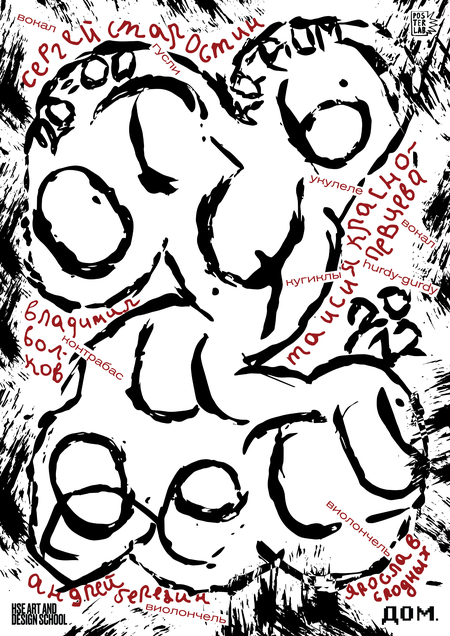 Before the poster was created, each student was given an assignment: the composition on the sheet should have caused a sense of action. My action sounded like a broom broom. In addition, only two household items and acrylic paint could be used in the process — I chose a curtain ring in the shower and an old wooden comb.