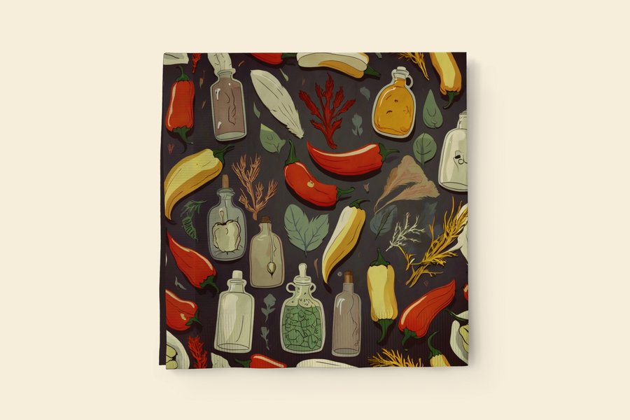 Промт: a pattern that can be used in a witch style napkin design. The pattern consists of peppers, herbs, garlics, crow feathers and bottles of potions. Colors: black, red, green and yellowish-white. Использованные инструменты: Leonardo AI, Upscayl.
