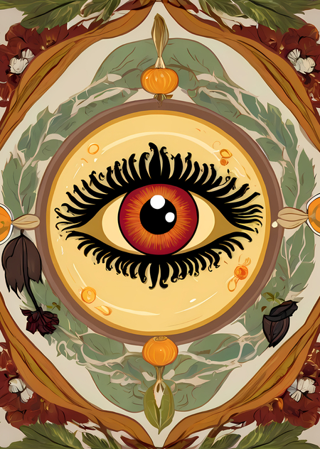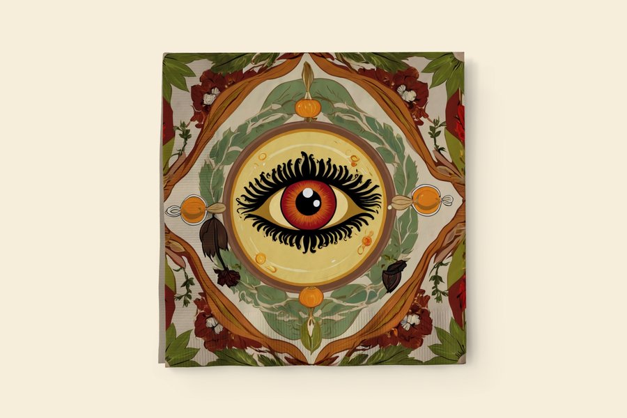 Промт: a pattern that can be used for a witch themed cafe napkin. In the center of the pattern there is an eye, around which there are small green elements in the form of greenery and garlic. the napkin has a red border. Colors red white yellow black. Использованные инструменты: Leonardo AI, Upscayl.