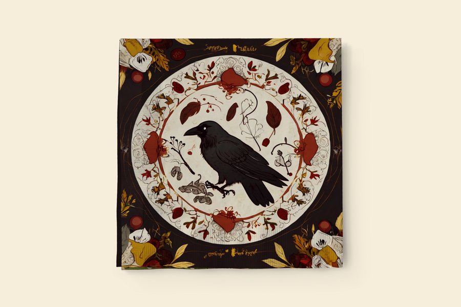 Промт: a pattern that can be used as a napkin for a witchy-style cafe. The pattern should contain crow feathers and red berries. In the center of the composition: a small raven. in a chef’s hat. Colors: white, yellow, red. Использованные инструменты: Leonardo AI, Upscayl.