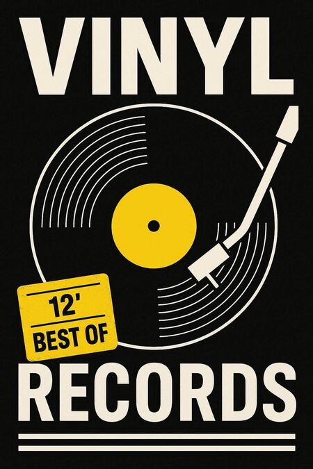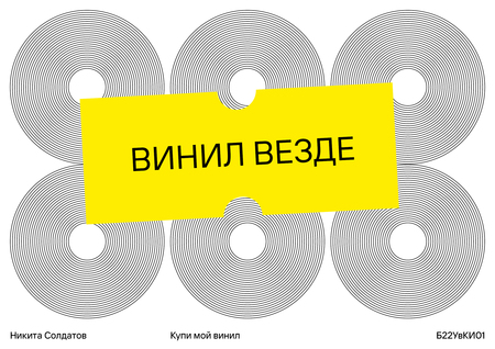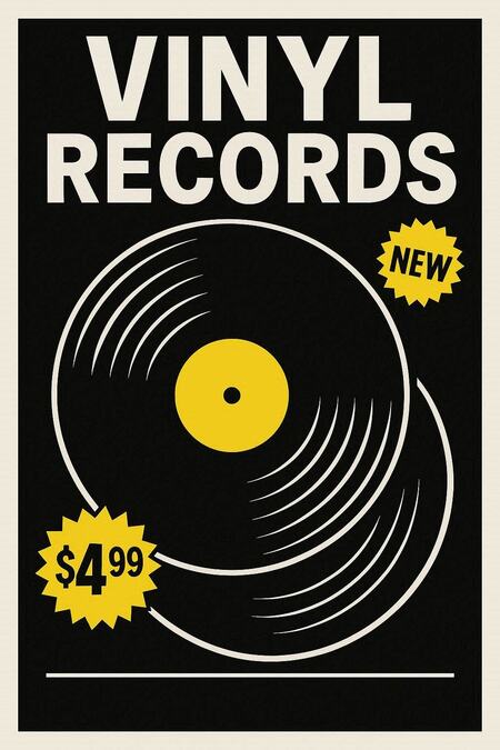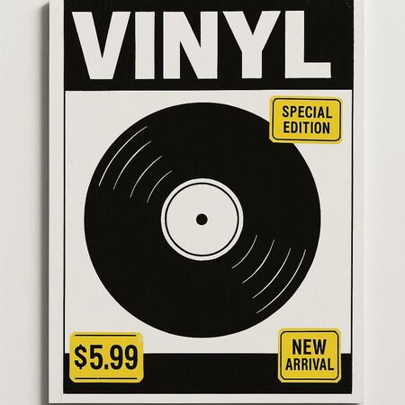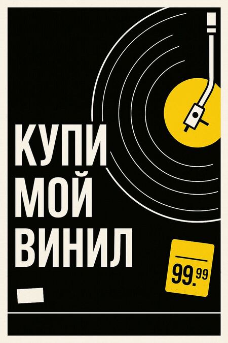 Вот он: Poster in a minimalist, graphic style about vinyl records. Sharp black and white contrasts, bright yellow accent details, clean geometric lines. The overall atmosphere of the poster is artistic, punk-inspired, and visually balanced, with modern typography. subtle elements resembling figured price stickers.