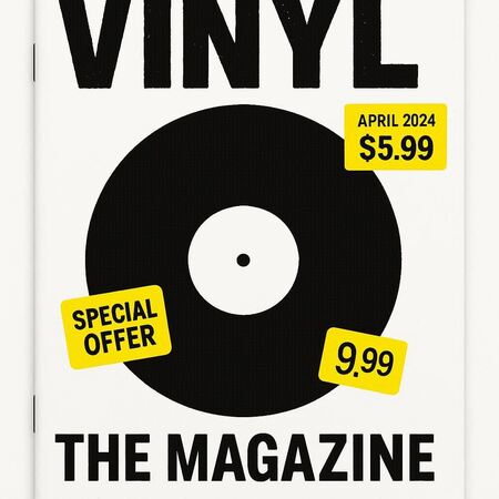 Magazine with minimalistic cover about vinyl records. Punk-like layout with sharp black and white contrast and bright yellow accents. Include the silhouette of a vinyl record and subtle elements resembling old store price stickers. Flat graphic design, balanced composition, vector-style, modern typography, high-contrast lighting.