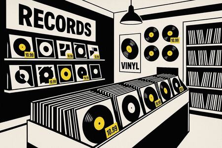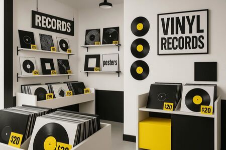 Realistic interior of a vinyl record store in a minimalist style. The space should feel like a three-dimensional version of a modern magazine cover — sharp black and white contrasts, bright yellow accent details, clean geometric lines. Include vinyl records, display shelves, and price tags styled as bold yellow stickers. The overall atmosphere is artistic, punk-inspired, and visually balanced, with modern typography on signs and posters.