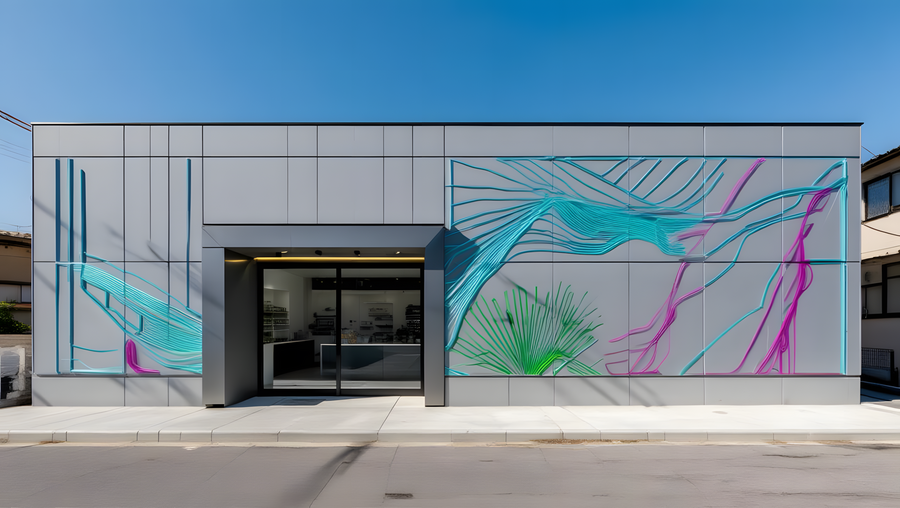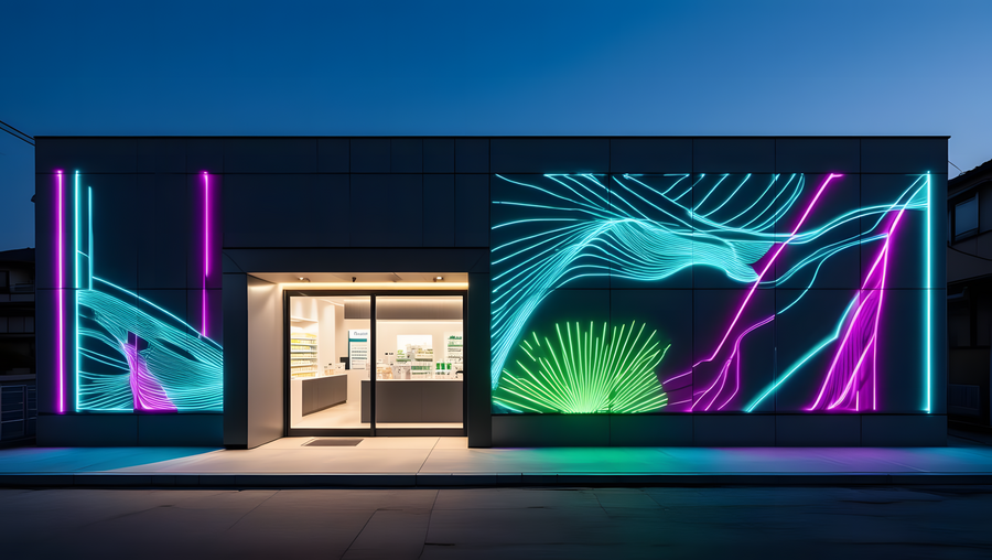 Здание было сгенерировано в Reve. Промт: Create a gray, minimalist pharmacy building with an abstract line pattern on the facade.