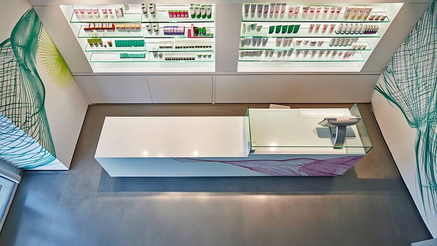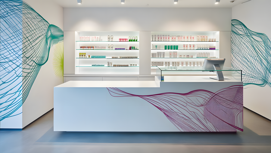 Пространство было сделано с помощью Reve. Промт: Create a pharmacy in the style of my brand. Make the space white and minimalist with a few brand patterns.