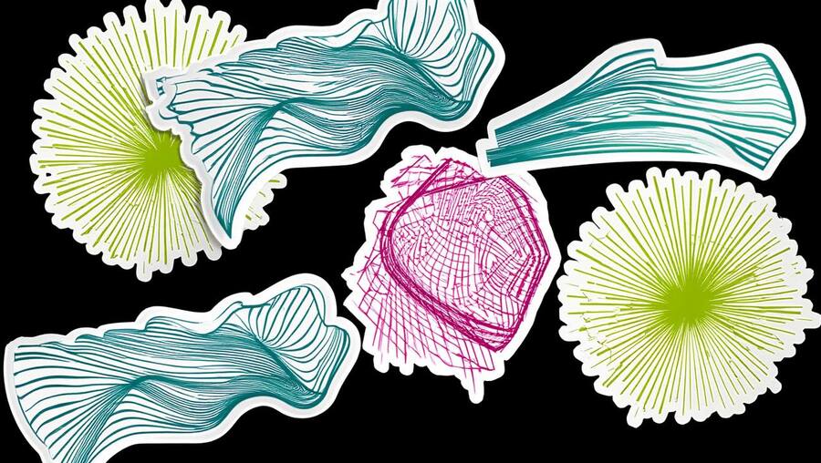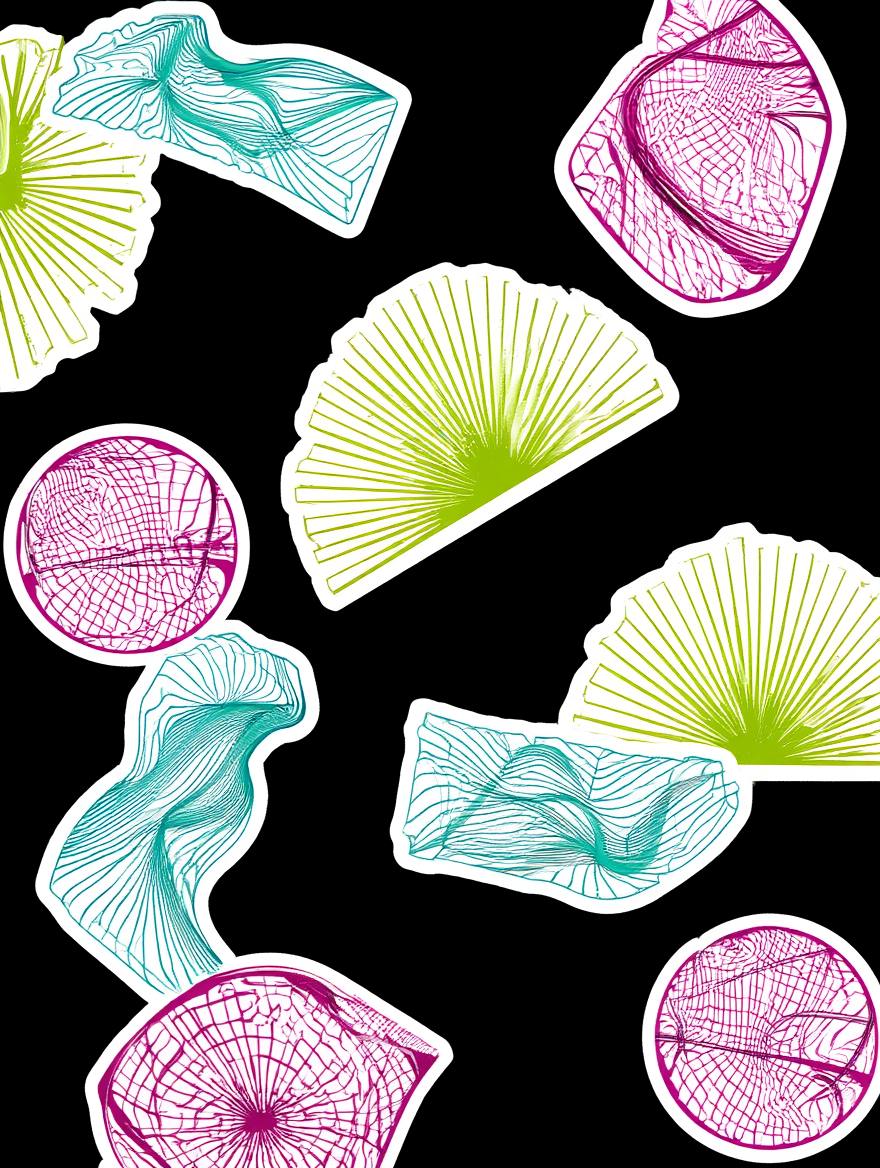Стикеры сгенерированы в Reve. Промт: Create stickers with patterns from the reference. The base of the stickers should repeat the outline of the pattern. Arrange them randomly on a black background.