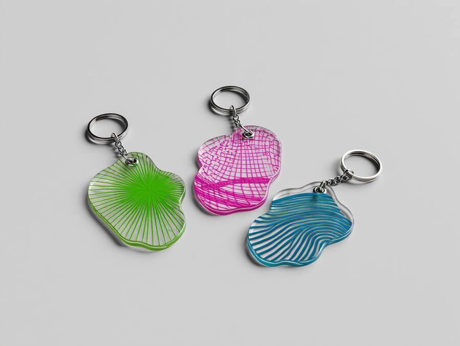 Изображения сгенерированы в Reve. Create keychains of different shapes using patterns from the references. Make each keychain with a separate abstract shape.