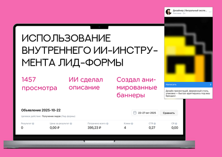 С помощью современных инструментов, нейросетей и аналитики, работала с айдентикой, запускала рекламу в ВК, продвигалась на Avito, VC.ru и в Telegram. Благодаря этому смогла привлечь новых клиентов из малого бизнеса и креативных индустрий, а также расширить профессиональное портфолио.