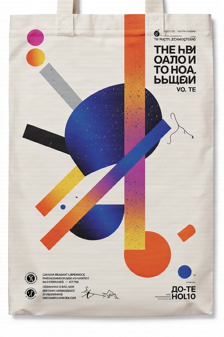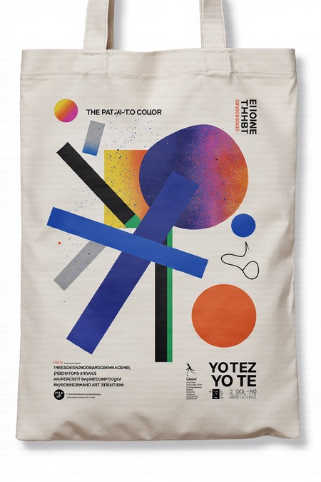 KREA AI canvas tote bag design for art exhibition «Путь к цвету. Ольга Розанова», geometric abstract print showing color evolution — from pale gray shapes to vibrant red, yellow, blue blocks, inspired by Russian avant-garde and Olga Rozanova paintings, clean minimal modern museum style, high-contrast composition, elegant placement of logo, realistic mockup on neutral background