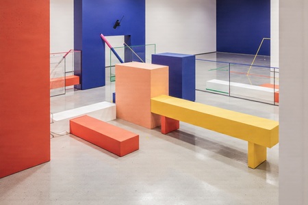 KREA AI exhibition interior design for art show «Путь к цвету. Ольга Розанова», inspired by Russian avant-garde and suprematism, sequence of rooms from pale monochrome to vivid color, geometric architecture, minimal modern museum space, soft lighting, clean lines, emphasis on color transformation and emotional rhythm, balance between form and abstraction, immersive experience, neutral floor and walls as canvas for color evolution
