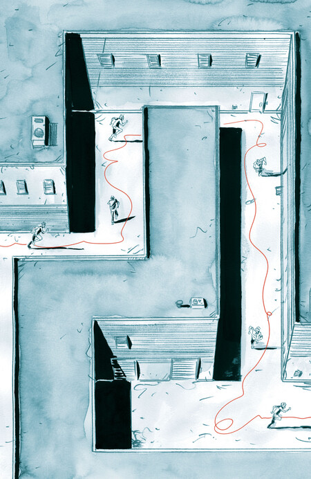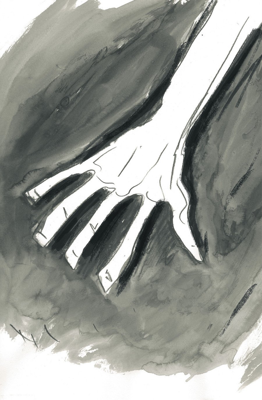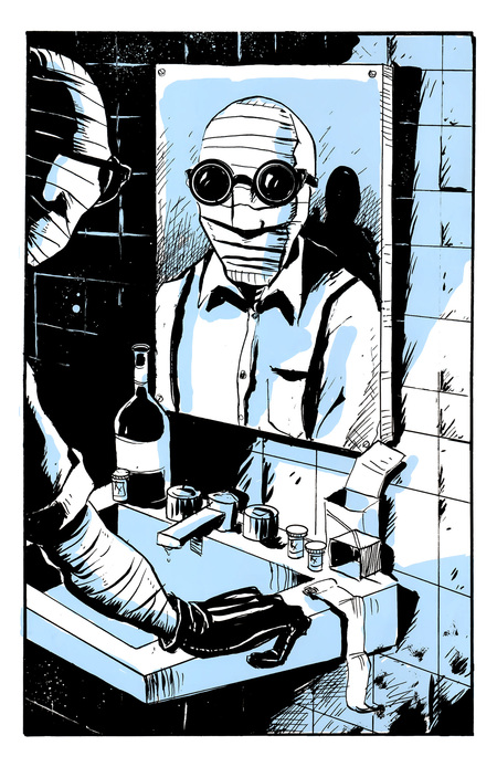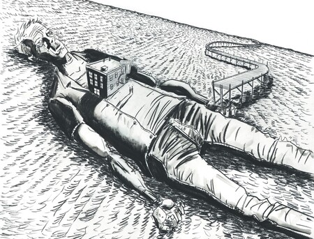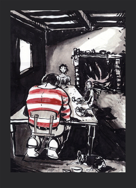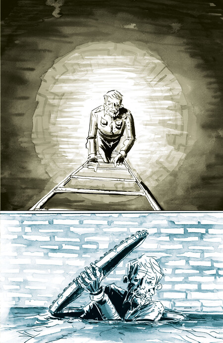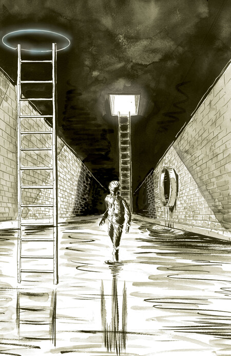 «Lost Dogs» — это история о моряке, потерявшем свою семью и, кажется, потерявшем самого себя. Здесь прослеживаются схожий с «Лабиринтом» сюжетный мотив утраты близких людей, однако красным художник выделяет главного героя и кровь, а не потерянные воспоминания.