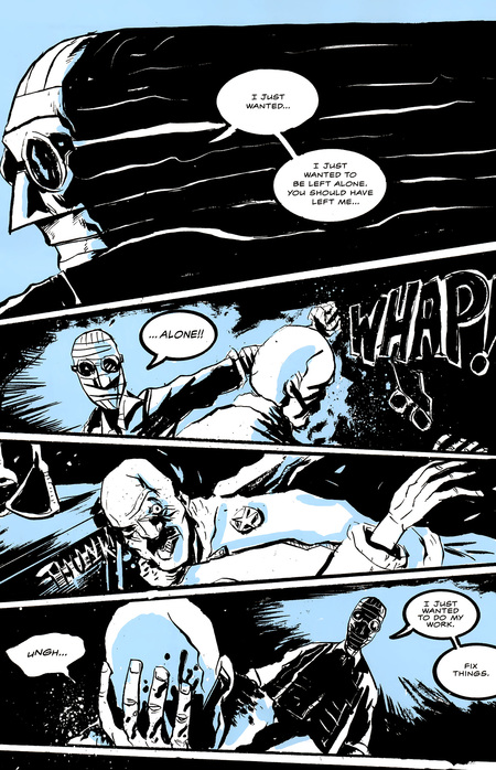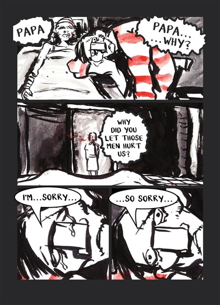 Комикс довольно жестокий, а красный как акцентный цвет, в связи с его восприятием в массовом сознании, подчеркивает беспощадные реалии мира, в котором разворачивается действие. Кроме того, неряшливость и грубость стиля рисовки делает и без того тяжелый комикс более давящим на читателя.
