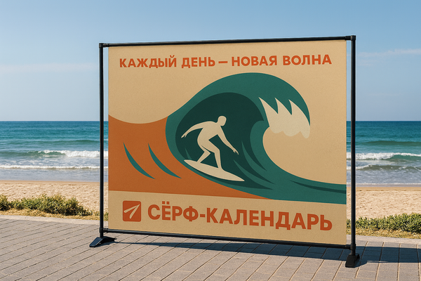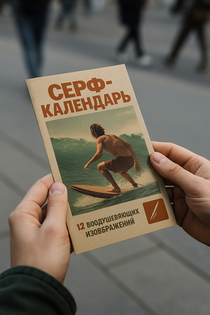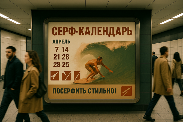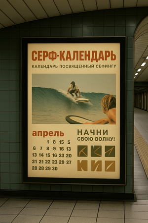 > Изобрази в том же стиле афишу серф-календаря на билборде в метро. Мимо проходят люди, дальний план