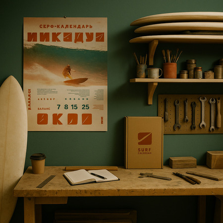 > Создай изображение мастерской по изготовлению серф-календаря. Ее стены должны быть цвета #3f645c.