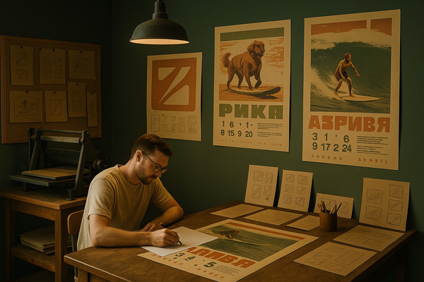 > Мастерская должна иметь общий вид всей комнаты с печатным станком, набросками календаря, календарем на стене и человеком, который сидит за столом и что-то рисует на бумаге.