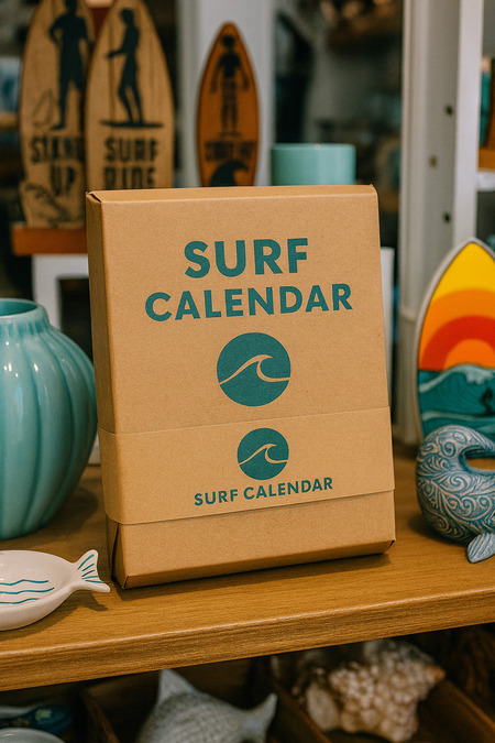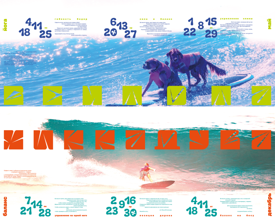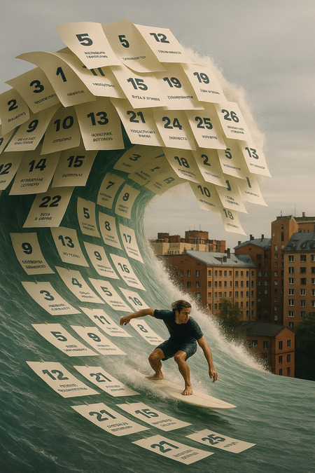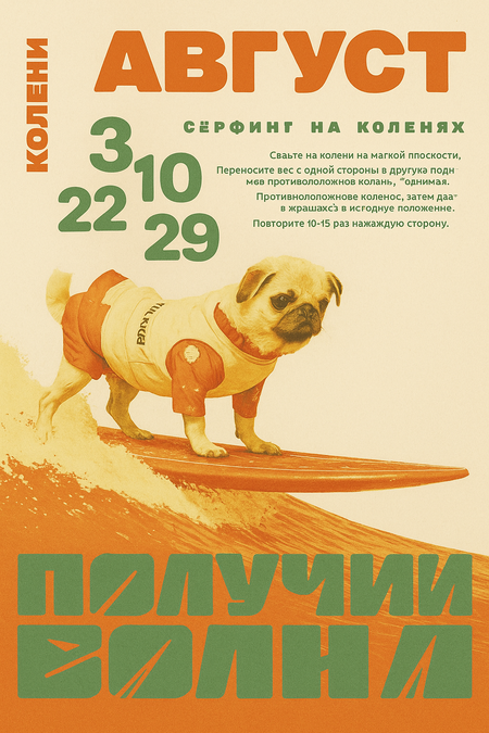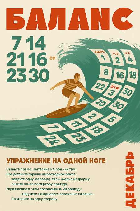 > Создай изображение серфера на волне, которая состоит из листов календаря. Каждый лист — день месяца, и на каждом — мини-упражнение или вдохновляющая фраза. Стиль — фирменная палитра, реализм, динамика. Размер 2480 * 3500