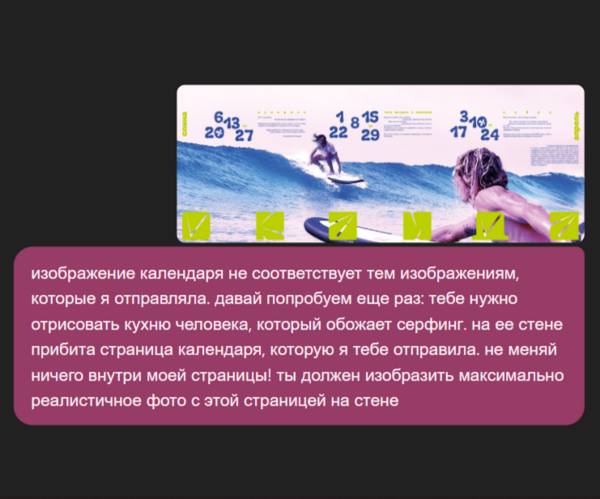 Так, Chat GPT на основе описания проекта и изображений календаря разработал несколько промптов, один из которых я использовала для реализации обложки.