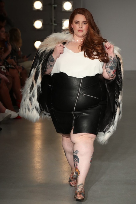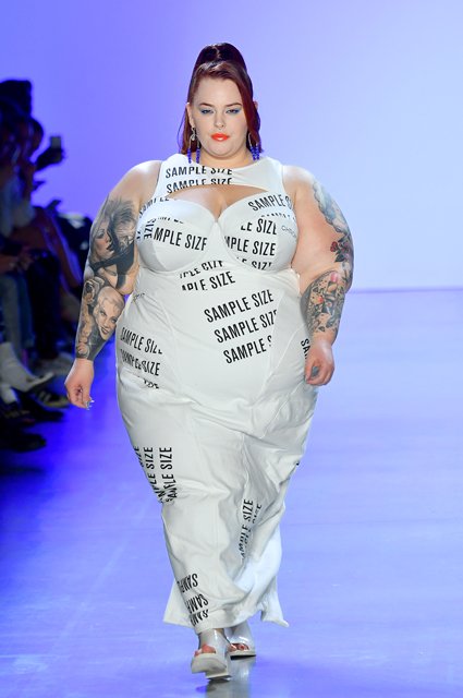 На подиуме Тесс появилась в облегающем белом платье с принтом в виде фразы Sample size — таким образом бренд хотел привлечь внимание к тому, что в мире моды многие коллекции отшиваются на так называемый нулевой размер, который подходит только на идеальные модельные фигуры.