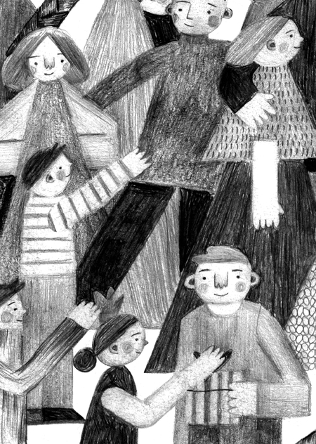 Семьи бывают маленькие, а есть и очень большие. В моих работах я показываю моменты из жизни разных семей, сочетая в композициях и сюжетах от 5 до 30 персонажей. Будь то свадьба или застолье, семейное фото или прогулка на велосипедах — везде можно найти забавные ситуации и взаимодействия.