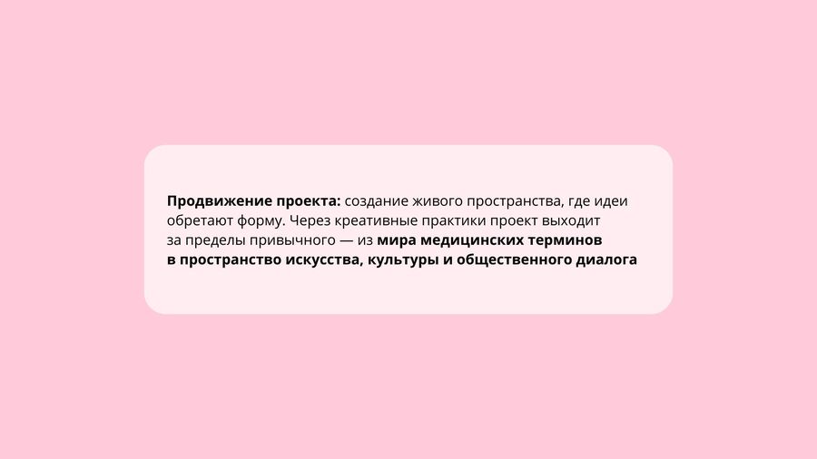 Через искусство проект становится социально значимой инициативой, которая вдохновляет, учит и объединяет. Повышая его видимость, мы делаем шаг к тому, чтобы забота о здоровье, в частности, о женском здоровье, стала частью повседневной жизни.